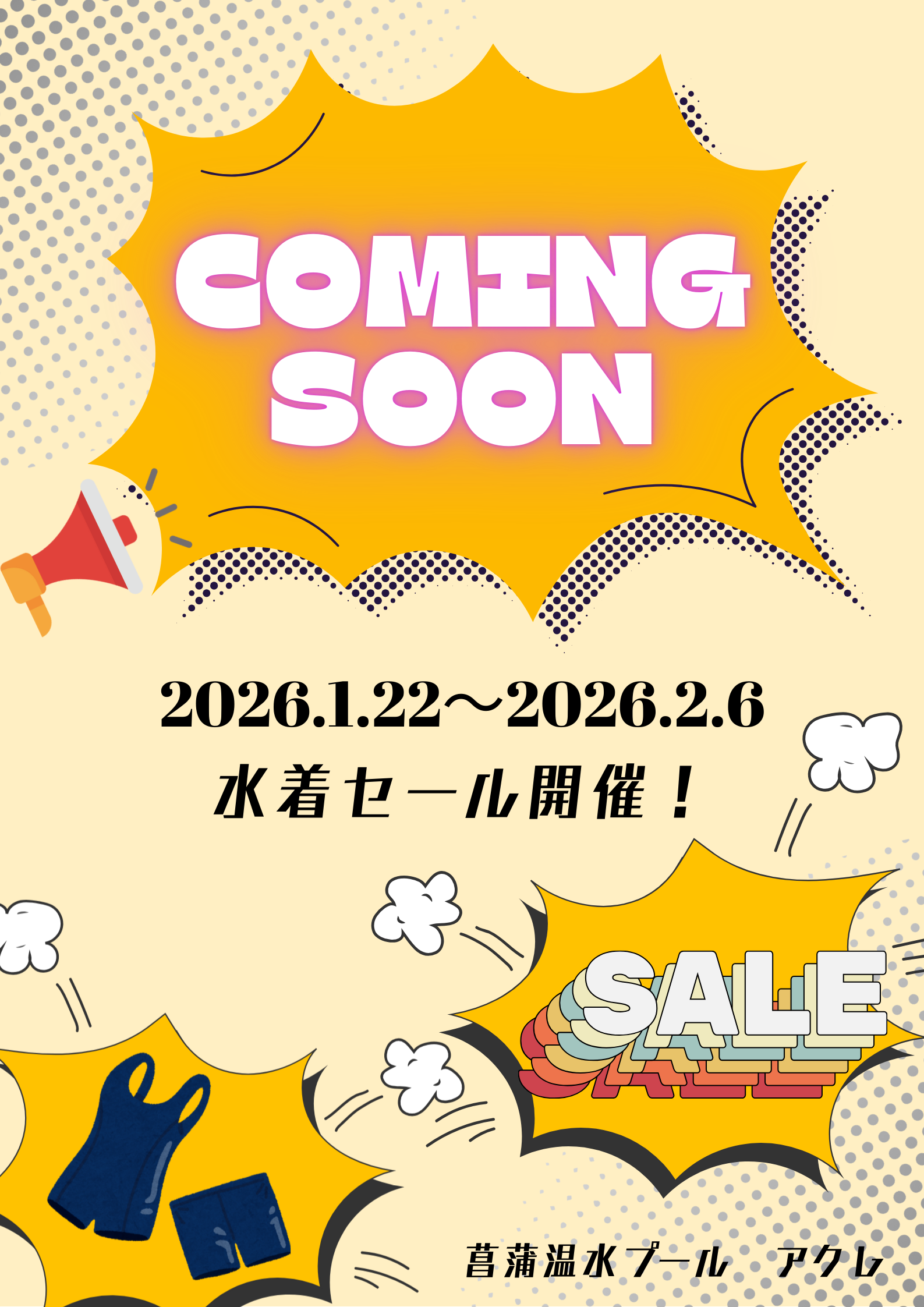 【菖蒲温水プール アクレ】水着セールのお知らせ 2026.01.12 日頃より、菖蒲温水プールアクレをご利用いただき誠にありがとうございます。 1/22~2/6まで期間限定で水着のセールを開催いたします! 現品限りとなりますので皆さま是非お越しください🏊🏊🏊