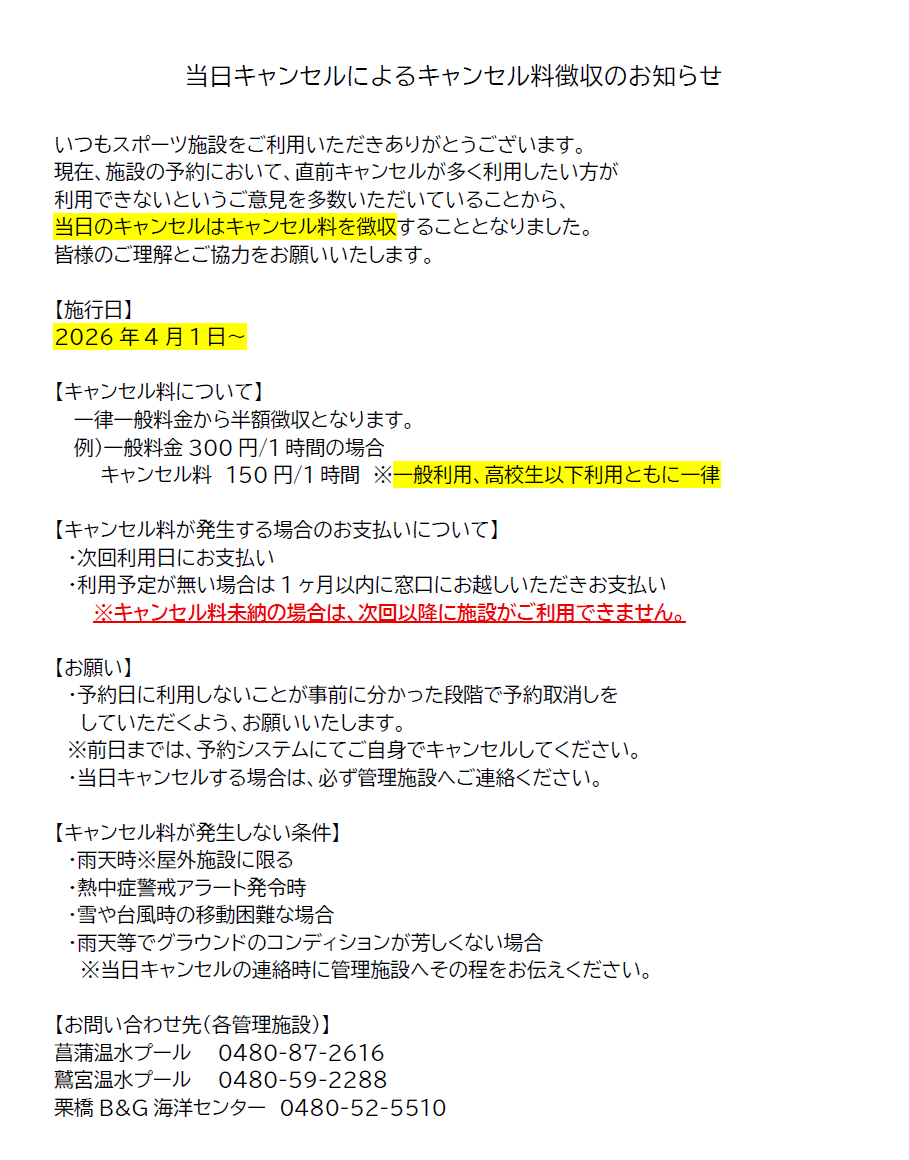 【重要】4/1~当日キャンセル料の徴収について
