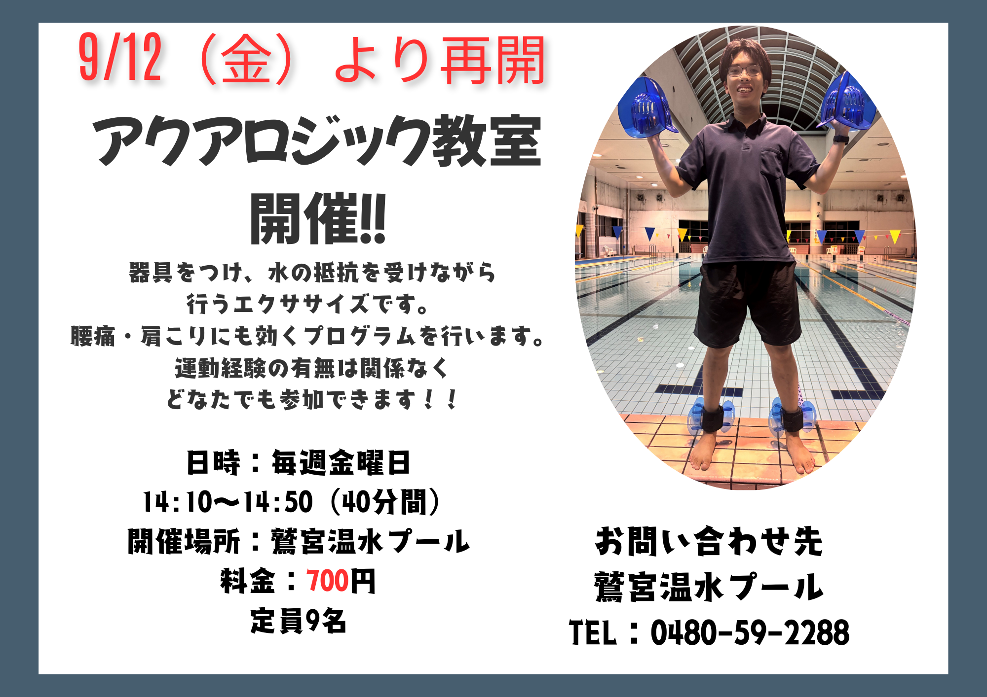 【鷲宮温水プール】アクアロジック教室再開のお知らせ 2025.09.12 日頃より鷲宮温水プールをご利用いただきありがとうございます。 9月より、アクアロジック教室を再開いたします。 時間、曜日等は変更ないので、皆さまぜひお越しください。 皆さまのお越しをお待ちしております。