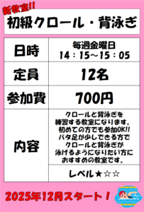 【鷲宮温水プール】新規教室開催のお知らせ 2025.11.21 日頃より鷲宮温水プールをご利用いただきありがとうございます。 12月5日より、新規教室 初級クロール・背泳ぎ を開催いたします。 毎週金曜日14:15~15:05 参加費700円 定員12名 クロールと背泳ぎを教わることができる教室になります。 バタ足が少しできる方でクロール・背泳ぎができるようになりたい方ぜひ参加してみてください。 皆様のご参加をお待ちしております。
