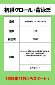 【鷲宮温水プール】新規教室の開催のお知らせ 2025.11.21 日頃より鷲宮温水プールをご利用いただきありがとうございます。 12月より、新規教室を開催します。 毎週金曜日14:15~15:05で クロールと背泳ぎを教わることができる教室になります。 バタ足が少しできる方でクロール・背泳ぎができるようになりたい方ぜひ参加してみてください。 皆様のご参加をお待ちしております。