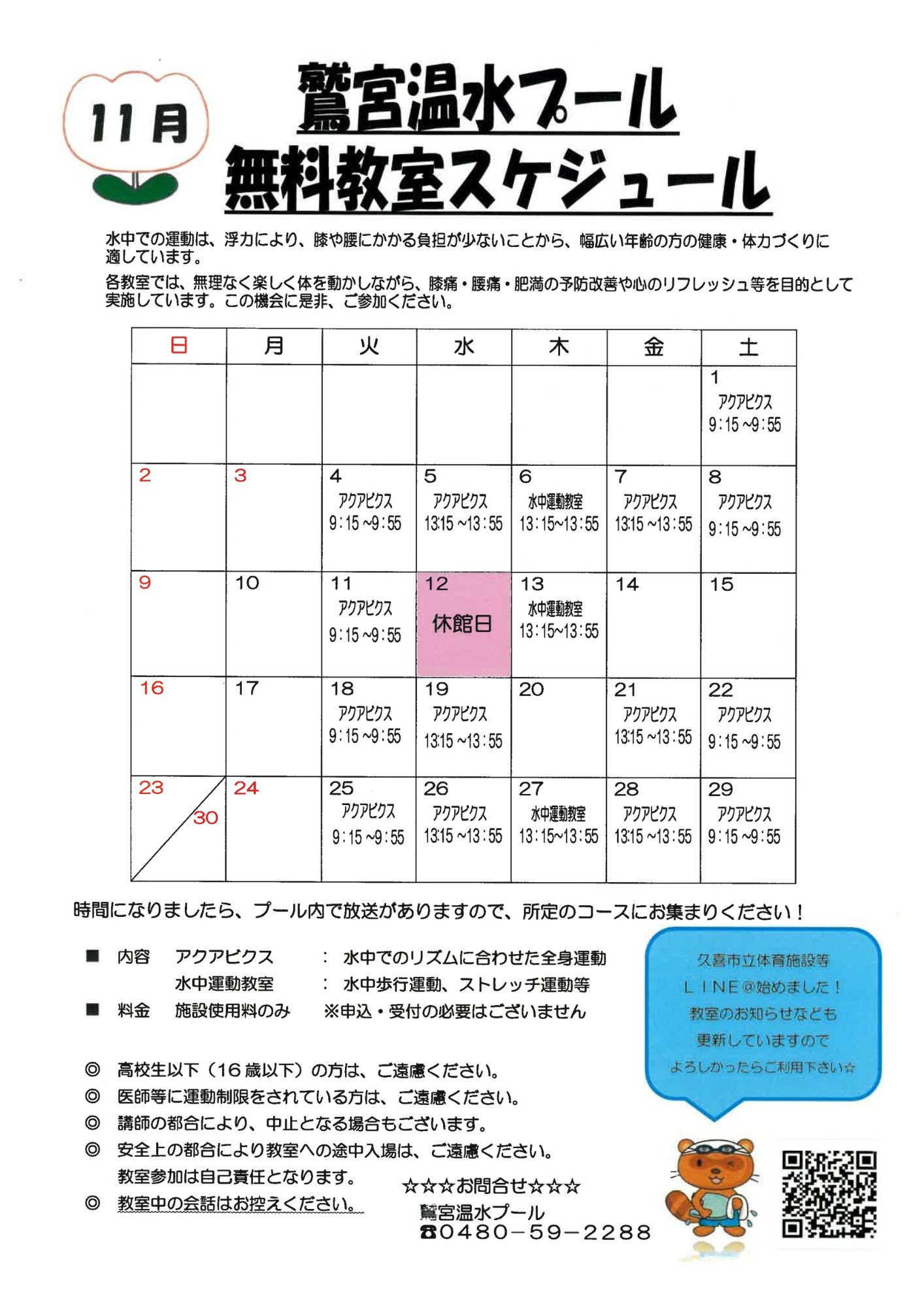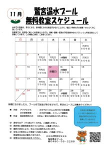 【鷲宮温水プール】11月度無料教室スケジュールのお知らせ 2025.10.22 日頃より鷲宮温水プールをご利用いただき誠にありがとうございます。 11月度無料教室スケジュールをお知らせいたします。 皆さまのお越しをお待ちしております。