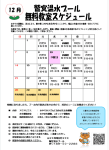 【鷲宮温水プール】12月無料教室のお知らせ 2025.11.16 日頃より鷲宮温水プールをご利用いただき誠にありがとうございます。 12月度無料教室スケジュールをお知らせいたします。 皆さまのお越しをお待ちしております。