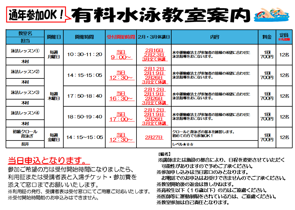 【鷲宮温水プール】2・3月有料教室スケジュール 2026.01.25 日頃より鷲宮温水プールをご利用いただき誠にありがとうございます。 当施設より2・3月の有料教室スケジュールのお知らせです。 皆様のお越しお待ちしております。