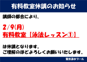 【鷲宮温水プール】2/9(月)泳法レッスン①休講のお知らせ 2026.02.06 日頃より鷲宮温水プールをご利用いただき誠にありがとうございます。 講師の都合により 2/9(月)の泳法レッスン①は休講となります。 ご理解の程よろしくお願いいたします。