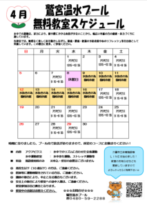 【鷲宮温水プール】4月無料教室スケジュールのお知らせ 2026.03.16 日頃より、鷲宮温水プールをご利用いただき誠にありがとうございます。 4月の無料教室スケジュールのお知らせになります。 4月は水抜き休館があります。 お間違えの無いようお越しください。