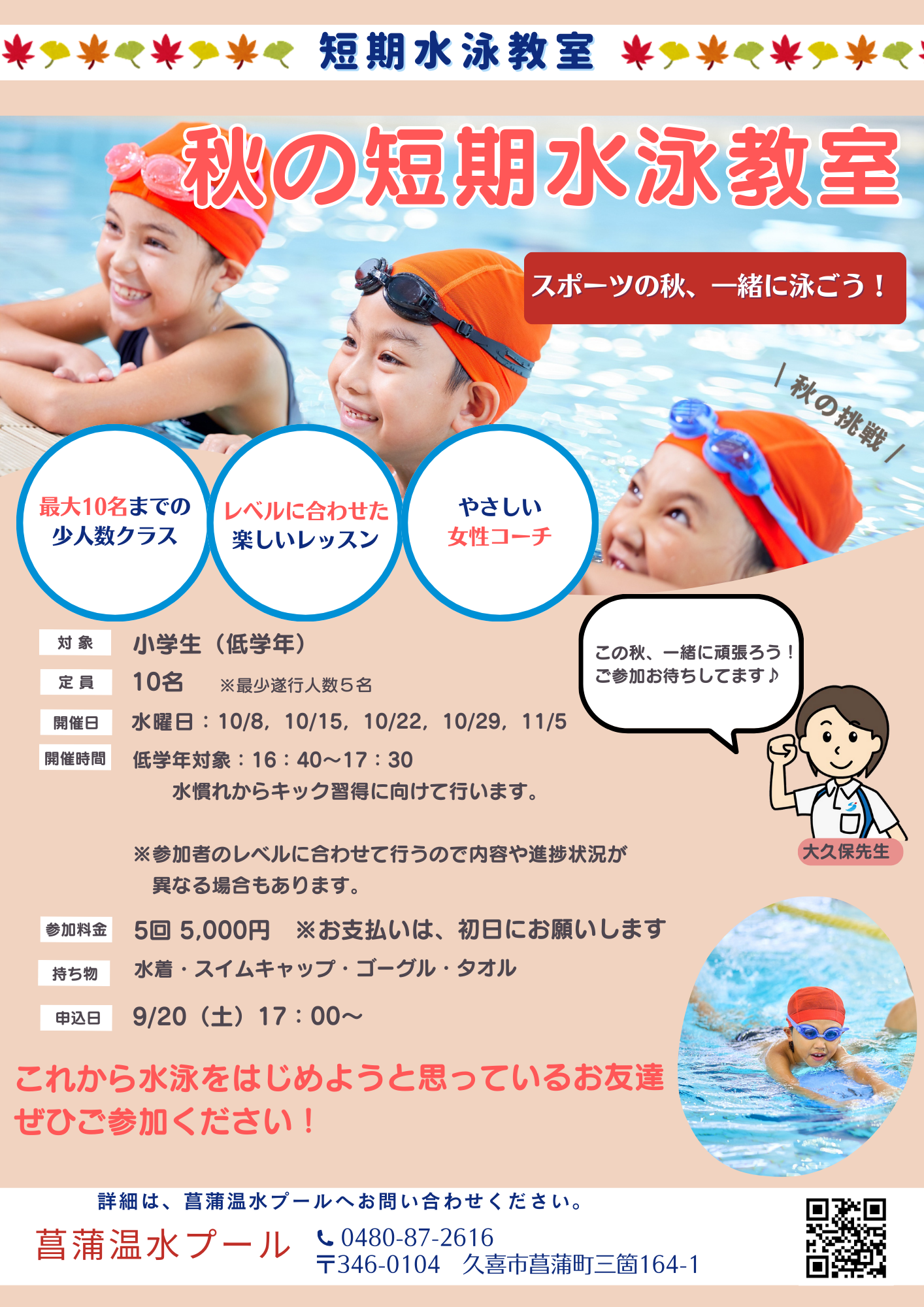 【菖蒲温水プール】秋短期水泳教室(小学校低学年)開催のお知らせ 2025.09.21 いつも菖蒲温水プールをご利用いただきありがとうございます。 この度、秋短期水泳教室を開催することとなりました。 ぜひ、ご参加お待ちしております! 詳細は、画像をご確認ください。