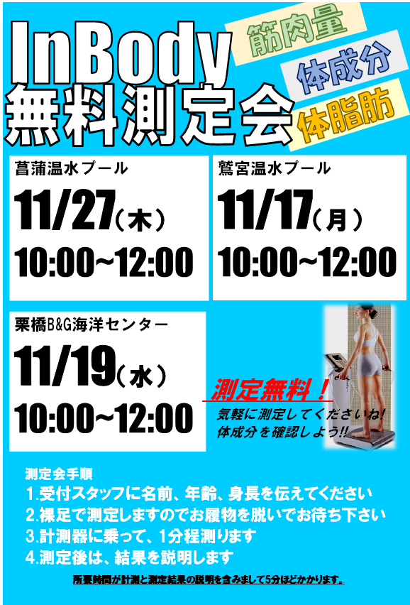 11月インボディ測定会のお知らせ 2025.11.15 いつも施設をご利用いただきありがとうございます。 11月のインボディ無料測定会の日時が決まりましたのでお知らせいたします。 11/17 (月) 10:00-12:00 @鷲宮温水プール 11/19(水) 10:00-12:00 @栗橋B&G海洋センター 11/27(木) 10:00-12:00 @菖蒲温水プールアクレ 皆さまのご参加お待ちしております。