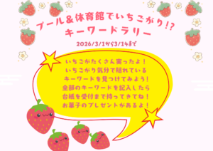【イベント】プール&体育館でいちごがり?キーワードラリー 2026.02.28 日頃より、久喜市体育施設をご利用いただき誠にありがとうございます。 3/1~3/14までいちごがりをモチーフとしたキーワードラリーを開催します🍓 キーワードが完成したら受付でお菓子をプレゼント! ぜひお気軽にご参加ください(^^♪