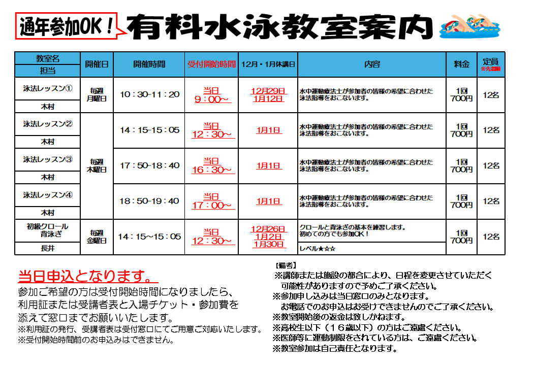 【鷲宮温水プール】12・1月度有料教室の開催のお知らせ 2025.11.16 日頃より鷲宮温水プールをご利用いただき誠にありがとうございます。 12・1月の有料教室のお知らせになります。 12/28~1/4の間は年末年始休館になります。 アクアロジック教室は講師の都合により終了になりました。 12月より初級クロール・背泳ぎ教室が始まります。 皆さまぜひご参加ください。 皆さまのお越しをお待ちしています。