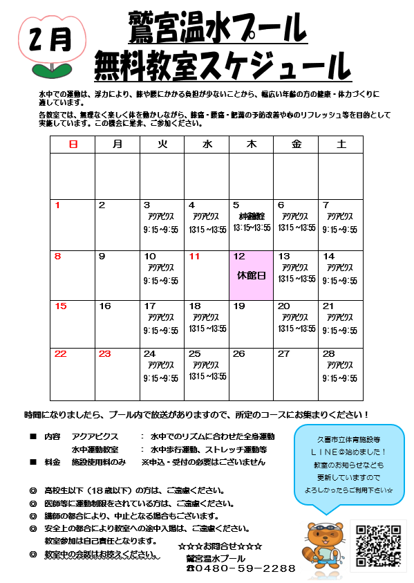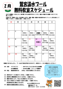 【鷲宮温水プール】2月無料教室スケジュール 2026.01.25 日頃より鷲宮温水プールをご利用いただき誠にありがとうございます。 当施設より、無料教室スケジュールのお知らせになります。 皆様のお越しをお待ちしております。