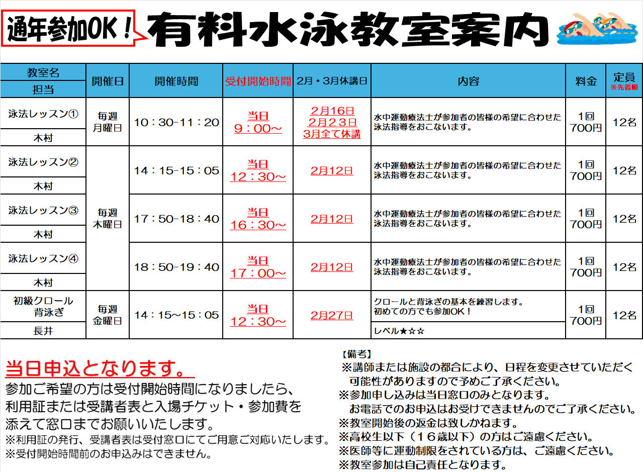 当日申込(先着順) ※各教室、受付時間が異なりますのでご確認ください。 |